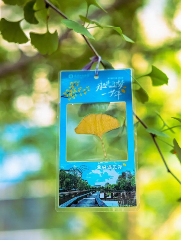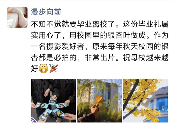 银杏象征着坚韧、沉着,同时也代表着爱与守护,这份银杏叶书签寄托着母校的祝福和期盼,希望同学们去到祖国需要的地方,像银杏树一样扎根成长,坚韧挺拔,枝繁叶茂。不少毕业生在自己的朋友圈表达收到礼物后的惊喜与感动。