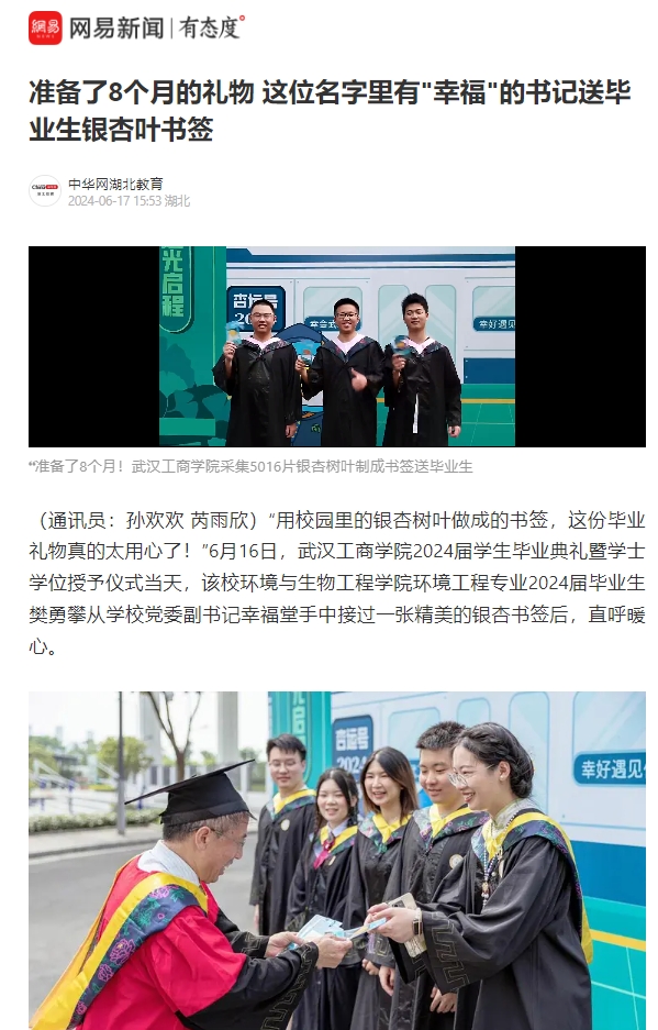 (通讯员:孙欢欢 芮雨欣)“用校园里的银杏树叶做成的书签,这份毕业礼物真的太用心了!”6月16日,新葡的京集团35222vip2024届学生毕业典礼暨学士学位授予仪式当天,该校环境与生物工程学院环境工程专业2024届毕业生樊勇攀从学校党委副书记幸福堂手中接过一张精美的银杏书签后,直呼暖心。
