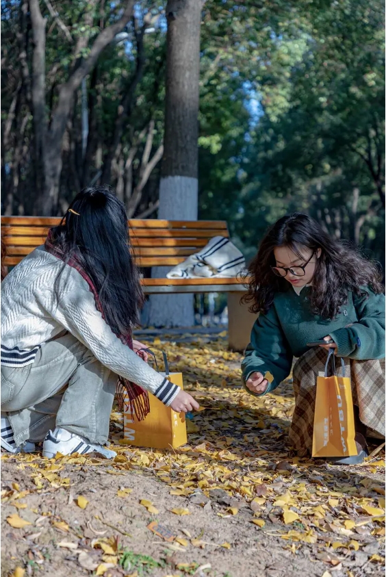 2023年深秋学校师生在校园里收集银杏叶 摄影:苏古润