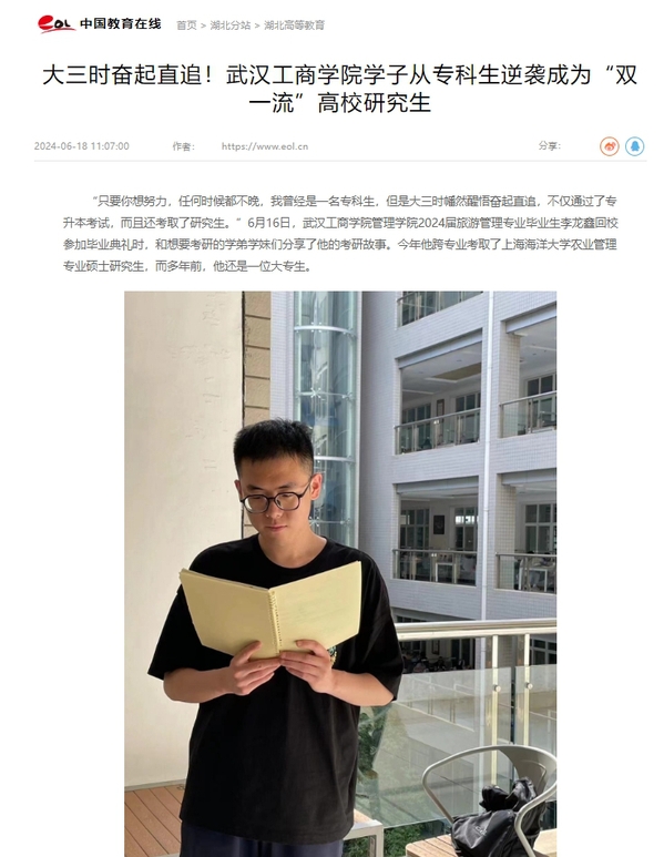 “只要你想努力,任何时候都不晚,我曾经是一名专科生,但是大三时幡然醒悟奋起直追,不仅通过了专升本考试,而且还考取了研究生。”6月16日,新葡的京集团35222vip管理学院2024届旅游管理专业毕业生李龙鑫回校参加毕业典礼时,和想要考研的学弟学妹们分享了他的考研故事。今年他跨专业考取了上海海洋大学农业管理专业硕士研究生,而多年前,他还是一位大专生。