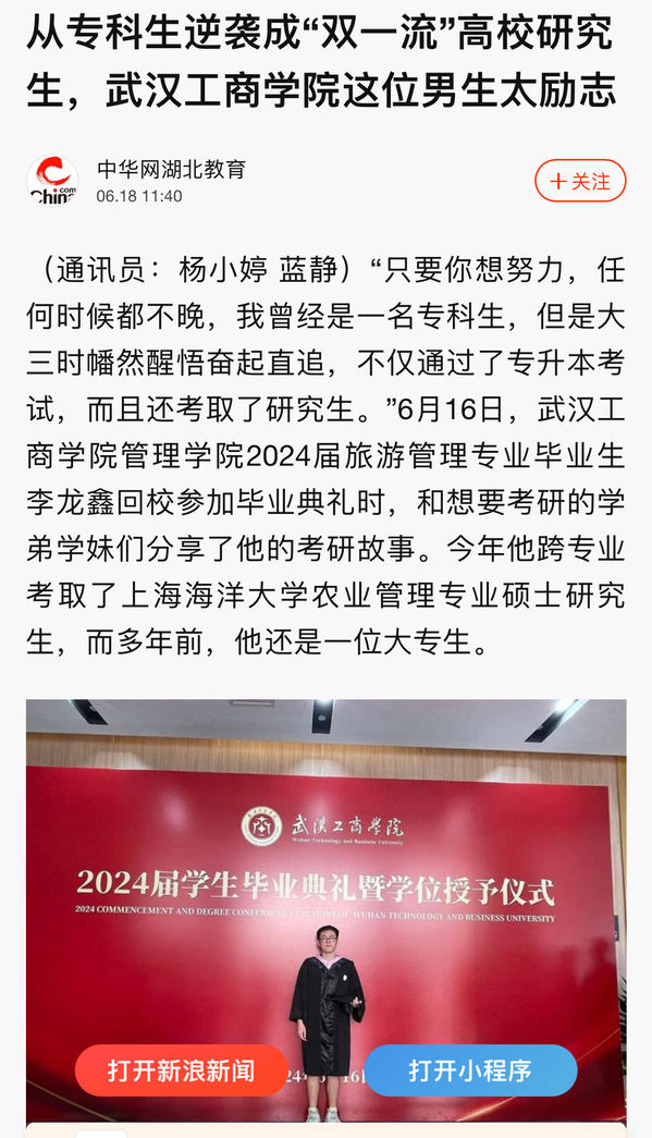 (通讯员:杨小婷 蓝静)“只要你想努力,任何时候都不晚,我曾经是一名专科生,但是大三时幡然醒悟奋起直追,不仅通过了专升本考试,而且还考取了研究生。”6月16日,新葡的京集团35222vip管理学院2024届旅游管理专业毕业生李龙鑫回校参加毕业典礼时,和想要考研的学弟学妹们分享了他的考研故事。今年他跨专业考取了上海海洋大学农业管理专业硕士研究生,而多年前,他还是一位大专生。