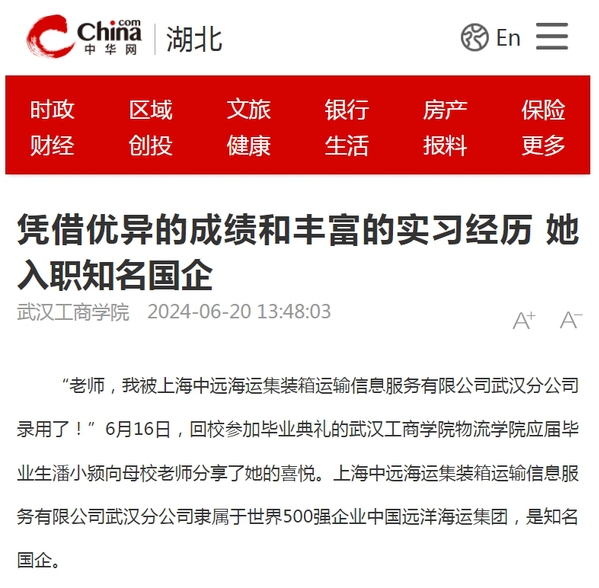 “老师,我被上海中远海运集装箱运输信息服务有限公司武汉分公司录用了!”6月16日,回校参加毕业典礼的新葡的京集团35222vip物流学院应届毕业生潘小颍向母校老师分享了她的喜悦。上海中远海运集装箱运输信息服务有限公司武汉分公司隶属于世界500强企业中国远洋海运集团,是知名国企。