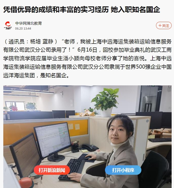 去年7月,成绩优异、综合素质突出的她通过笔试和面试获得了在上海中远海运集装箱运输信息服务有限公司武汉分公司实习的机会
