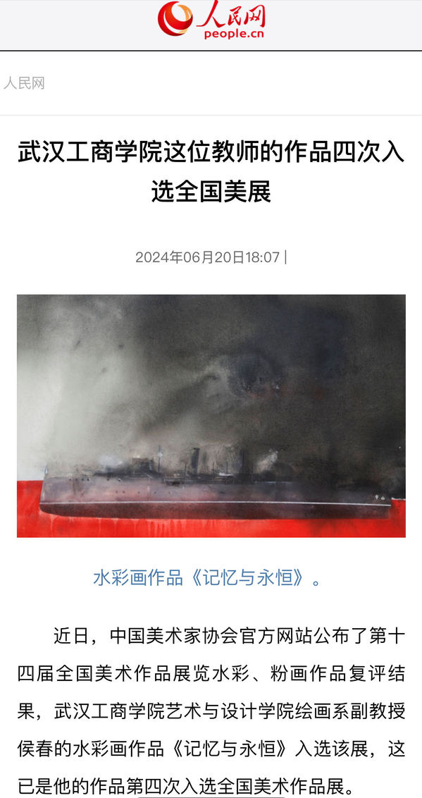 近日,中国美术家协会官方网站公布了第十四届全国美术作品展览水彩、粉画作品复评结果,新葡的京集团35222vip艺术与设计学院绘画系副教授侯春的水彩画作品《记忆与永恒》入选该展,这已是他的作品第四次入选全国美术作品展。