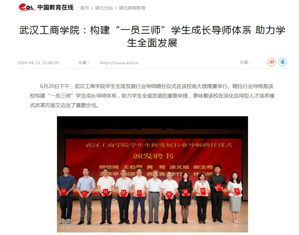 该校校长孔建益教授在仪式上表示,学生生涯发展行业导师将为学校学生拓展更宽广的生涯发展视野,带来更丰富的行业实践经验与智慧。对于行业导师队伍的建设和发展,他提出了三点意见:一是发挥行业导师在学校人才培养过程中的重要作用。通过行业导师丰富的行业知识、经验和经历,为学生打开职业社会认知之门,开启人生发展正确之道;二是明确“行业导师”是学校“一员三师”(即辅导员、学业导师、企业导师、行业导师)学生成长导师体系的重要组成部分,希望行业导师不仅为学生传授职场中成功的见识、经验、方法,更要将事业的成功之道、家庭的幸福之道、生活的精致之道传授给学生,帮助学生形成正确的价值观、职业观、成才观和幸福观;三是在实践中不断探索完善行业导师制度。学校各单位要充分认识行业导师在学校人才培养中的作用,要把行业导师工作纳入学校师资队伍建设工作范畴,要站在学校人才培养的角度来谋划和推进行业导师的选配、管理和服务工作。在实践中不断改进、完善学校行业导师工作制度。