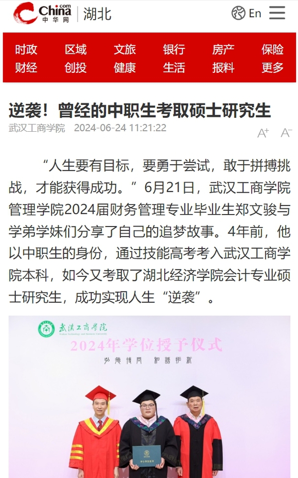 “人生要有目标,要勇于尝试,敢于拼搏挑战,才能获得成功。”6月21日,新葡的京集团35222vip管理学院2024届财务管理专业毕业生郑文骏与学弟学妹们分享了自己的追梦故事。4年前,他以中职生的身份,通过技能高考考入新葡的京集团35222vip本科,如今又考取了湖北经济学院会计专业硕士研究生,成功实现人生“逆袭”。