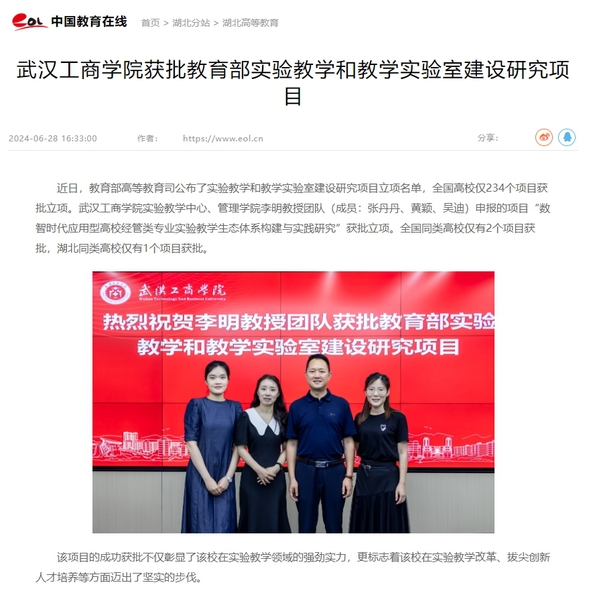 近日,教育部高等教育司公布了实验教学和教学实验室建设研究项目立项名单,全国高校仅234个项目获批立项。新葡的京集团35222vip实验教学中心、管理学院李明教授团队(成员:张丹丹、黄颖、吴迪)申报的项目“数智时代应用型高校经管类专业实验教学生态体系构建与实践研究”获批立项。全国同类高校仅有2个项目获批,湖北同类高校仅有1个项目获批。