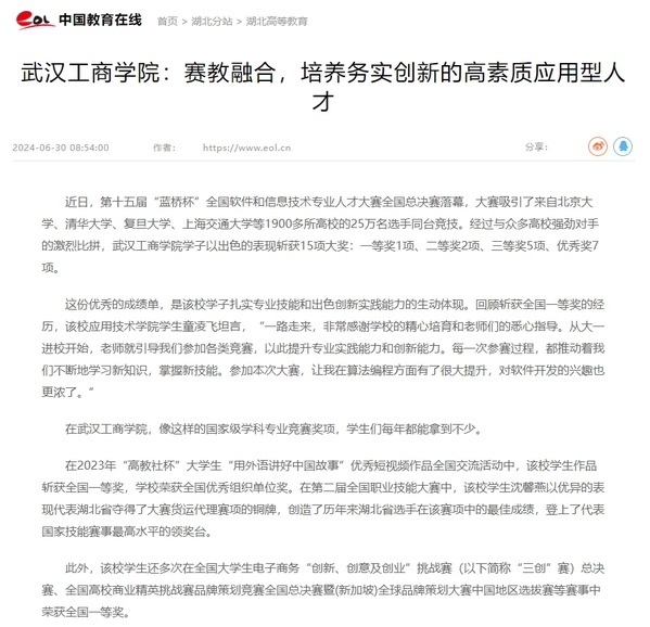 在2023年“高教社杯”大学生“用外语讲好中国故事”优秀短视频作品全国交流活动中,该校学生作品斩获全国一等奖,学校荣获全国优秀组织单位奖。在第二届全国职业技能大赛中,该校学生沈馨燕以优异的表现代表湖北省夺得了大赛货运代理赛项的铜牌,创造了历年来湖北省选手在该赛项中的最佳成绩,登上了代表国家技能赛事最高水平的领奖台。
