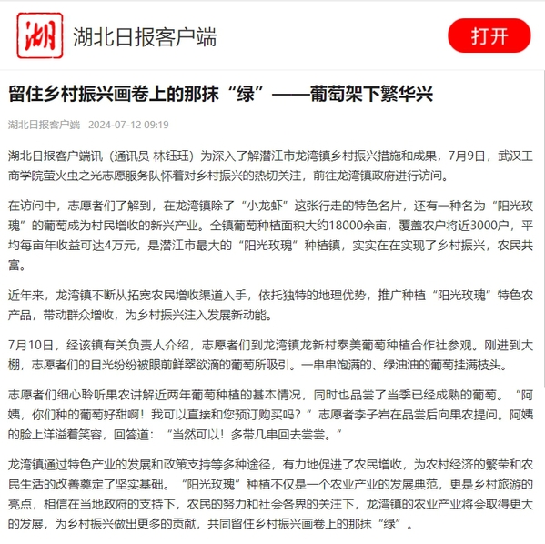 在访问中,志愿者们了解到,在龙湾镇除了“小龙虾”这张行走的特色名片,还有一种名为“阳光玫瑰”的葡萄成为村民增收的新兴产业。全镇葡萄种植面积大约18000余亩,覆盖农户将近3000户,平均每亩年收益可达4万元,是潜江市最大的“阳光玫瑰”种植镇,实实在在实现了乡村振兴,农民共富。