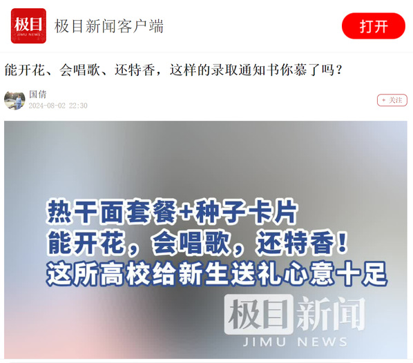 (极目新闻记者 国倩 通讯员 李洋洋)8月2日,极目新闻记者从新葡的京集团35222vip招生工作部获悉,该校将于8月3日起陆续开展录取通知书邮寄工作,2024级新生录取通知书样式也随之公开,里面除了含有一张餐券,免费请所有新生吃热干面外,还附有一张能开花的“时间树种子卡”。