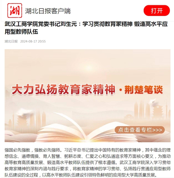 学习贯彻教育家精神,重在主动践行上见实效。学校充分发挥教育家精神的引领作用,着力培育“大国良师”,实施“一流学者”领航、“一流团队”筑基、“一流能力”登高、“一流机制”护航工程,努力培养造就一支师德高尚、业务精湛、结构合理、充满活力的高素质专业化教师队伍。学校培育创建全国党建工作标杆院系、样板支部,完善教师党支部书记“双带头人”和党建“双创”工作机制,通过师德师风专题教育活动、党支部“三会一课”、专题讲座等形式弘扬践行教育家精神,获批湖北省大学生思想政治教育工作先进基层单位;成立课程思政教学研究中心,构建了“思政必修课+思政选修课+课程思政”特色课程体系,课堂上学生的抬头率和点头率不断提升;依托4个国家级一流本科专业建设点、12个省级一流本科专业建设点,实施“一流专业群聚计划”,以5门国家级一流本科课程、32门省级一流本科课程为引领,实施“一流课程深耕计划”,培养了大批就业有实力、“双创”有能力、发展有潜力的高素质应用型人才;推进项目式、案例式、研讨式及信息化数智化教学工具应用等教学方法和手段改革,做好专业课程教学示范课、青年教师授课技能提升、实验教学案例大赛、新老教师“一帮一”导师选聘等工作,组织“基于OBE 理念的人才培养质量提升与高质量建设”等系列培训,构建三级学科竞赛指导体系,切实提升教师教学水平,推动质量文化与育人过程深度契合,擦亮“学在武工商”品牌;聚焦世界科技前沿、国家重大需求和未来产业发展,获批国家级科研项目14项,助推教师将更多科研成果转化为新质生产力。