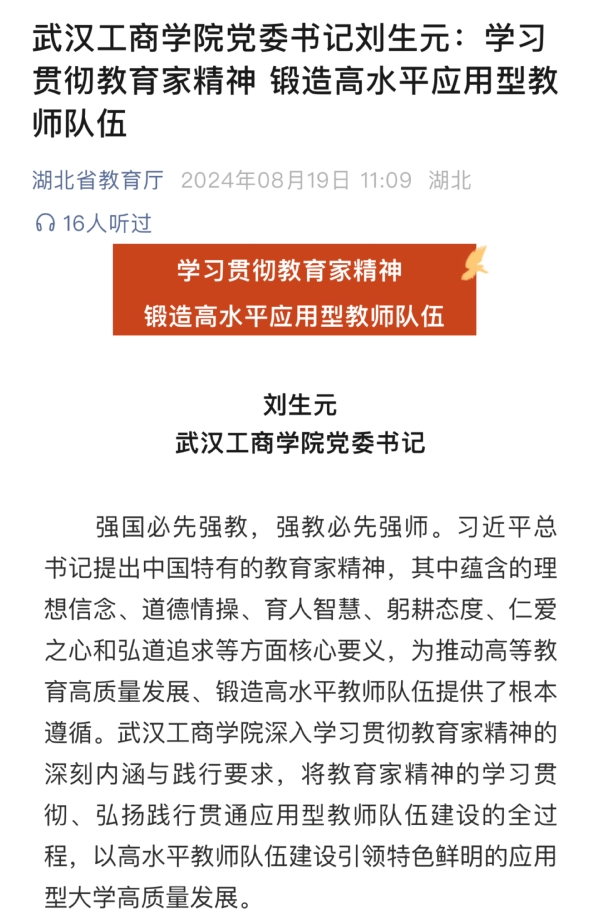 学习贯彻教育家精神,要在机制保障上谋创新。学校持续深化新时代应用型教师队伍建设的改革创新,将学习贯彻教育家精神落地落细。完善学校党委会、校务会、学院党政联席议事规则,健全学校监事会、学术委员会、学位评定委员会、教职工代表大会、学生代表大会等治理机构,充分发挥了广大教师在学校治理中的作用;优化师资结构,创新教师评价机制,实施分级分类聘任考核制度,提升教学科研型和社会服务与推广型教师比例,大力开展“双师双能型”教师选聘工作,入选湖北省深化新时代教育评价改革项目试点单位;成立深化产教融合工作领导小组,构建以行业(产业)学院为载体的产教深度融合运行机制,校企人才培养标准共商、课程共担、平台共建、师资共融、项目共研、质量共治,将产教融合贯穿于应用型人才培养全过程,建成现代产业学院2个、校企合作实习实训基地140余个;创新构建特色生涯教育课程体系,打造辅导员、学业导师、企业导师、行业导师的“一员三师”学生成长导师生态,获批成为唯一一所湖北省大学生生涯教育本土化试点高校;完善“大思政课”工作机制,校地共创优质内容,深挖红色资源,厚植传统文化,不断拓展“大思政课”实践基地和育人场域;创新开通校情民意反馈平台“校长直通车”,千方百计为广大师生办实事、好事,汇聚全校职能部门和各二级学院(部)的力量,共同致力于师生诉求的及时响应与妥善处理,截至目前,“校长直通车”共收到反映事项3300多项,平均办结时长11.9小时,一次性化解率达98%,师生满意率达96%,受到人民日报、新华社、中央电视台、光明日报等媒体的关注报道和点赞。