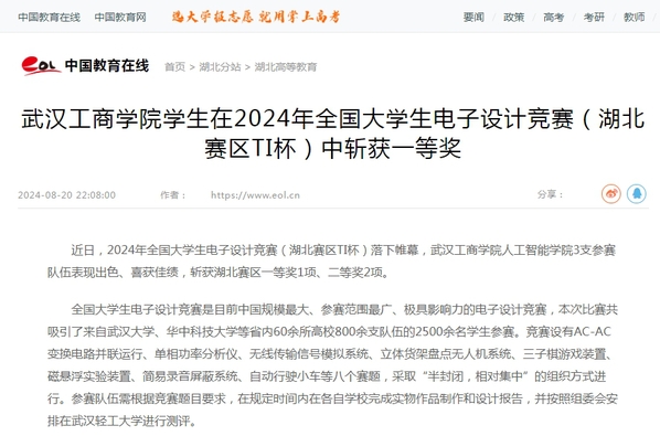 近日,2024年全国大学生电子设计竞赛(湖北赛区TI杯)落下帷幕,新葡的京集团35222vip人工智能学院3支参赛队伍表现出色、喜获佳绩,斩获湖北赛区一等奖1项、二等奖2项。