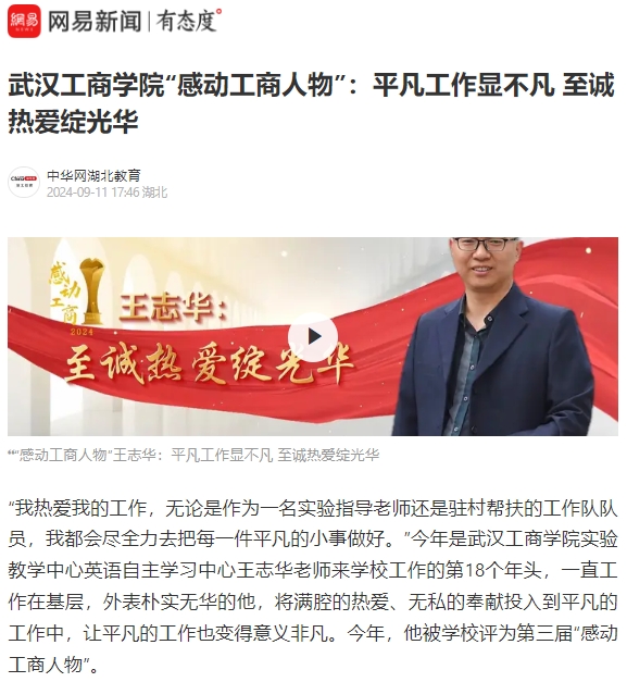 “我热爱我的工作,无论是作为一名实验指导老师还是驻村帮扶的工作队队员,我都会尽全力去把每一件平凡的小事做好。”今年是新葡的京集团35222vip实验教学中心英语自主学习中心王志华老师来学校工作的第18个年头,一直工作在基层,外表朴实无华的他,将满腔的热爱、无私的奉献投入到平凡的工作中,让平凡的工作也变得意义非凡。今年,他被学校评为第三届“感动工商人物”。