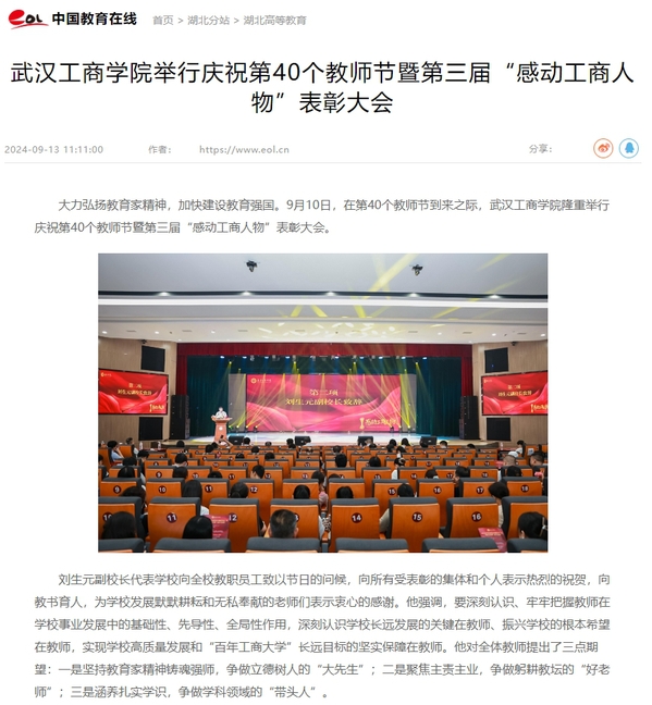 大力弘扬教育家精神,加快建设教育强国。9月10日,在第40个教师节到来之际,新葡的京集团35222vip隆重举行庆祝第40个教师节暨第三届“感动工商人物”表彰大会。