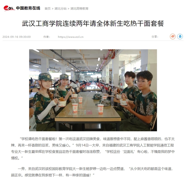据了解,这是该校连续第二年请全体新生吃热干面套餐。从2023年开始,该校给新生邮寄录取通知书时,内附一份专属见“面”礼——武汉特色美食“热干面套餐”餐券。与去年一样,2024级新生报到入学后,凭此券可于9月9日至9月15日期间,在该校的枫华园餐厅和杏韵园餐厅免费领取热干面套餐一份,套餐包含一份热干面和一杯豆浆。