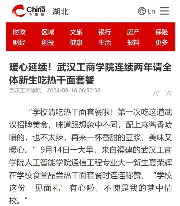 据了解,这是该校连续第二年请全体新生吃热干面套餐。从2023年开始,该校给新生邮寄录取通知书时,内附一份专属见“面”礼——武汉特色美食“热干面套餐”餐券。与去年一样,2024级新生报到入学后,凭此券可于9月9日至9月15日期间,在该校的枫华园餐厅和杏韵园餐厅免费领取热干面套餐一份,套餐包含一份热干面和一杯豆浆。