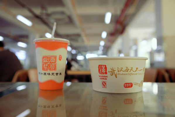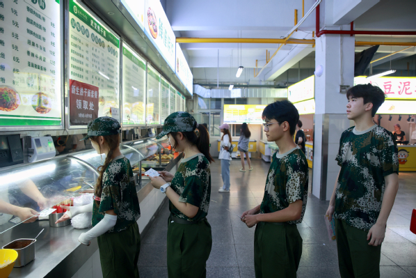 ▲新生们正在学校食堂吃热干面套餐 摄影:周逸文