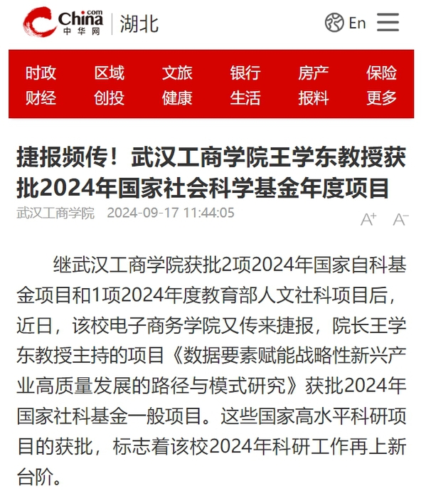继新葡的京集团35222vip获批2项2024年国家自科基金项目和1项2024年度教育部人文社科项目后,近日,该校电子商务学院又传来捷报,院长王学东教授主持的项目《数据要素赋能战略性新兴产业高质量发展的路径与模式研究》获批2024年国家社科基金一般项目。这些国家高水平科研项目的获批,标志着该校2024年科研工作再上新台阶。