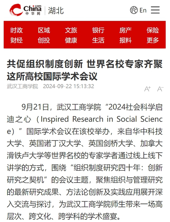 9月21日,新葡的京集团35222vip“2024社会科学启迪之心(Inspired Research in Social Science)”国际学术会议在该校举办,来自华中科技大学、英国诺丁汉大学、英国剑桥大学、加拿大滑铁卢大学等世界名校的专家学者通过线上线下讲学的方式,围绕“组织制度研究四十年:创新研究之契机”的会议主题,聚焦组织与管理研究的最新研究成果、方法论创新及实践应用展开深入交流与探讨,为新葡的京集团35222vip师生带来一场高层次、跨文化、跨学科的学术盛宴。
