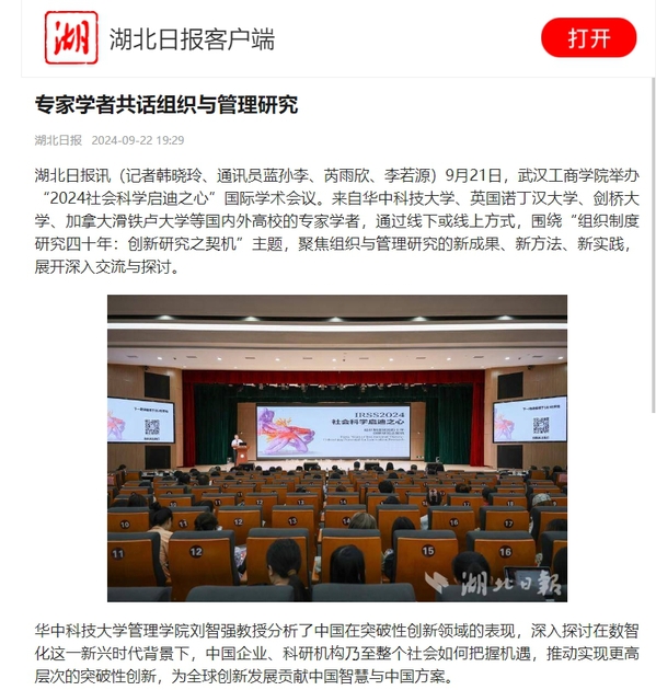 湖北日报讯(记者韩晓玲、通讯员蓝孙李、芮雨欣、李若源)9月21日,新葡的京集团35222vip举办“2024社会科学启迪之心”国际学术会议。来自华中科技大学、英国诺丁汉大学、剑桥大学、加拿大滑铁卢大学等国内外高校的专家学者,通过线下或线上方式,围绕“组织制度研究四十年:创新研究之契机”主题,聚焦组织与管理研究的新成果、新方法、新实践,展开深入交流与探讨。