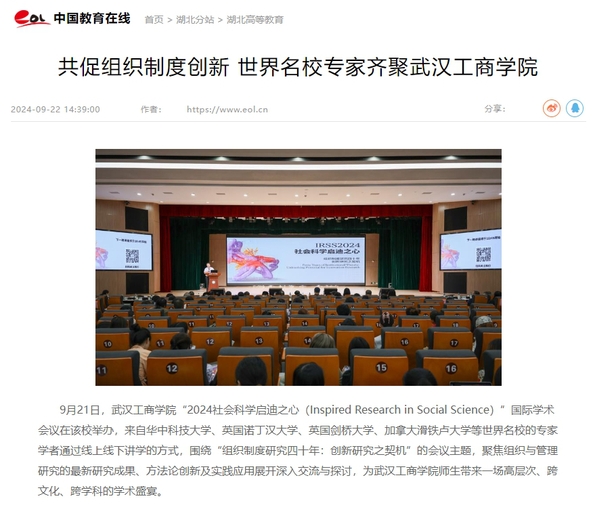 9月21日,新葡的京集团35222vip“2024社会科学启迪之心(Inspired Research in Social Science)”国际学术会议在该校举办,来自华中科技大学、英国诺丁汉大学、英国剑桥大学、加拿大滑铁卢大学等世界名校的专家学者通过线上线下讲学的方式,围绕“组织制度研究四十年:创新研究之契机”的会议主题,聚焦组织与管理研究的最新研究成果、方法论创新及实践应用展开深入交流与探讨,为新葡的京集团35222vip师生带来一场高层次、跨文化、跨学科的学术盛宴。