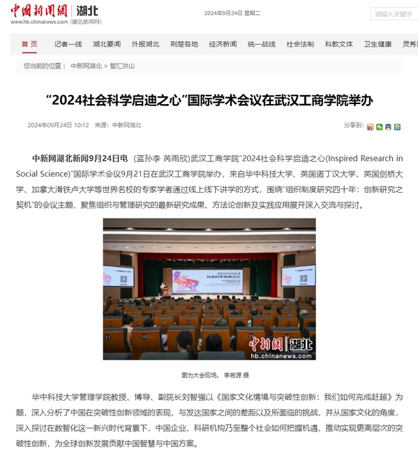 中新网湖北新闻9月24日电(蓝孙李 芮雨欣)新葡的京集团35222vip“2024社会科学启迪之心(Inspired Research in Social Science)”国际学术会议9月21日在新葡的京集团35222vip举办,来自华中科技大学、英国诺丁汉大学、英国剑桥大学、加拿大滑铁卢大学等世界名校的专家学者通过线上线下讲学的方式,围绕“组织制度研究四十年:创新研究之契机”的会议主题,聚焦组织与管理研究的最新研究成果、方法论创新及实践应用展开深入交流与探讨。