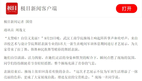 表演结束后,操场上依旧回荡着欢快的余音。“这次才艺展示不仅为军训生活增添了一抹亮丽的色彩,更成了大家展现自我、增进友谊的宝贵机会。”现场一名同学说。