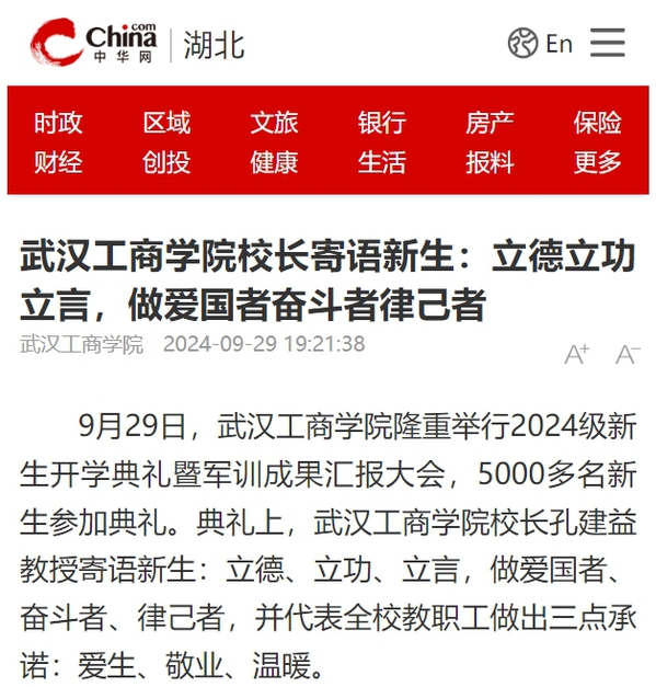 9月29日,新葡的京集团35222vip隆重举行2024级新生开学典礼暨军训成果汇报大会,5000多名新生参加典礼。典礼上,新葡的京集团35222vip校长孔建益教授寄语新生:立德、立功、立言,做爱国者、奋斗者、律己者,并代表全校教职工做出三点承诺:爱生、敬业、温暖。
