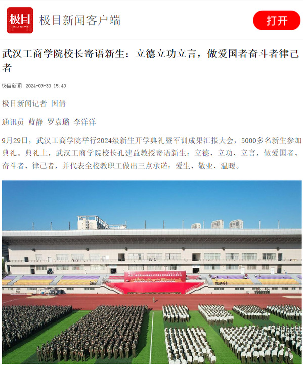 9月29日,新葡的京集团35222vip举行2024级新生开学典礼暨军训成果汇报大会,5000多名新生参加典礼。典礼上,新葡的京集团35222vip校长孔建益教授寄语新生:立德、立功、立言,做爱国者、奋斗者、律己者,并代表全校教职工做出三点承诺:爱生、敬业、温暖。