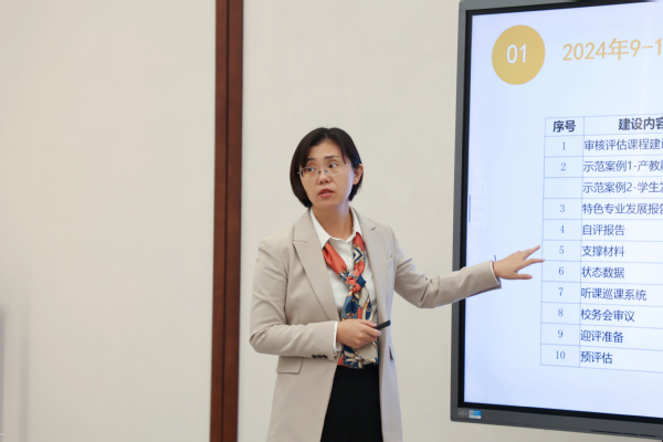 亓小林校助围绕评建工作进展、定量指标完成情况、自评报告及相关报告概况三个方面,作了《2024年审核评估阶段性工作》汇报。她首先对学校在2024年9-12月期间开展的审核评估评建工作进行了梳理与阶段性总结;其次是对学校人财物指标现状、定量指标对比常模的优劣势表现、未来需重点关注的指标等相关数据进行深入对比,直观明了地指出当前学校存在的劣势指标以及自评自建阶段存在的问题和不足;第三是对自评报告的框架和主要内容进行了介绍,重点围绕学校办学方向与本科地位、培养过程、教学资源与利用、师资队伍、学生发展、质量保障、教学成效七个指标,详细介绍学校评建工作的成效和问题;此外她还以图示的方式展示了学校产教融合案例、学生发展案例以及特色专业发展报告的概要。