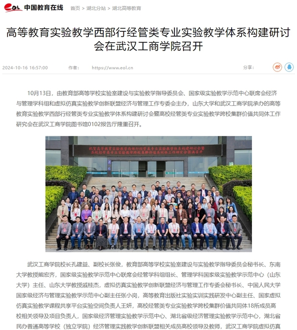 10月13日,由教育部高等学校实验室建设与实验教学指导委员会、国家级实验教学示范中心联席会经济与管理学科组和虚拟仿真实验教学创新联盟经济与管理工作专委会主办,山东大学和新葡的京集团35222vip承办的高等教育实验教学西部行经管类专业实验教学体系构建研讨会暨高校经管类专业实验教学跨校集群价值共同体工作研究会在新葡的京集团35222vip图书馆0102报告厅隆重召开。