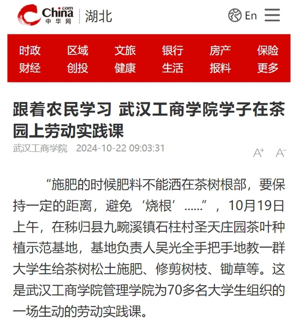该校管理学院党总支书记王留志介绍,为了提升劳动教育的效果,学院积极创新劳动教育教学模式,丰富劳动育人教育阵地,与九畹溪镇石柱村圣天庄园建立劳动教育实践基地,让学生从理论课堂走向实践课堂,从校园走进茶园,跟着农民学习,从中体会劳动的艰辛、快乐和价值。