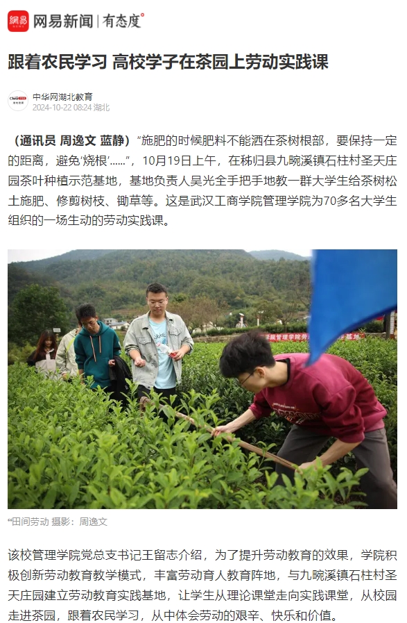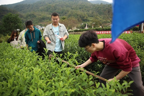 该校管理学院党总支书记王留志介绍,为了提升劳动教育的效果,学院积极创新劳动教育教学模式,丰富劳动育人教育阵地,与九畹溪镇石柱村圣天庄园建立劳动教育实践基地,让学生从理论课堂走向实践课堂,从校园走进茶园,跟着农民学习,从中体会劳动的艰辛、快乐和价值。