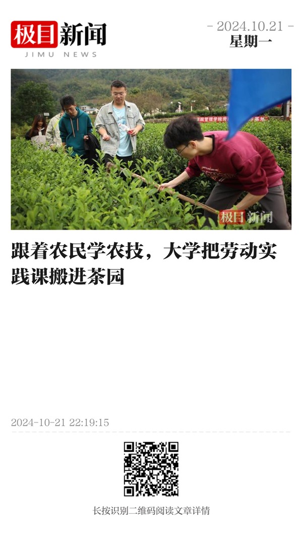 该校管理学院党总支书记王留志介绍,为了提升劳动教育的效果,学院积极创新劳动教育教学模式,丰富劳动育人教育阵地,与九畹溪镇石柱村圣天庄园建立劳动教育实践基地,让学生从理论课堂走向实践课堂,从校园走进茶园,跟着农民学习,从中体会劳动的艰辛、快乐和价值。