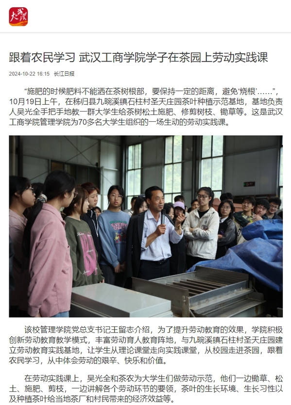 该校管理学院党总支书记王留志介绍,为了提升劳动教育的效果,学院积极创新劳动教育教学模式,丰富劳动育人教育阵地,与九畹溪镇石柱村圣天庄园建立劳动教育实践基地,让学生从理论课堂走向实践课堂,从校园走进茶园,跟着农民学习,从中体会劳动的艰辛、快乐和价值。