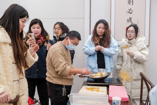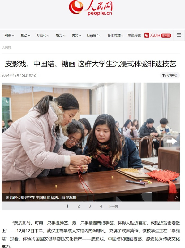 这是该校国学教育研究院、校团委共同开展的非遗实践课程,特邀中华文化促进会剪纸艺术委员会会员、武汉剪纸项目区级非物质文化遗产代表性传承人金俊安,武汉市民间文艺家协会会员、糖画传承人李瑞刚,武汉民间文艺家协会会员李丹丹走进校园,为同学们展示皮影戏、中国结、糖画等非遗传统技艺。