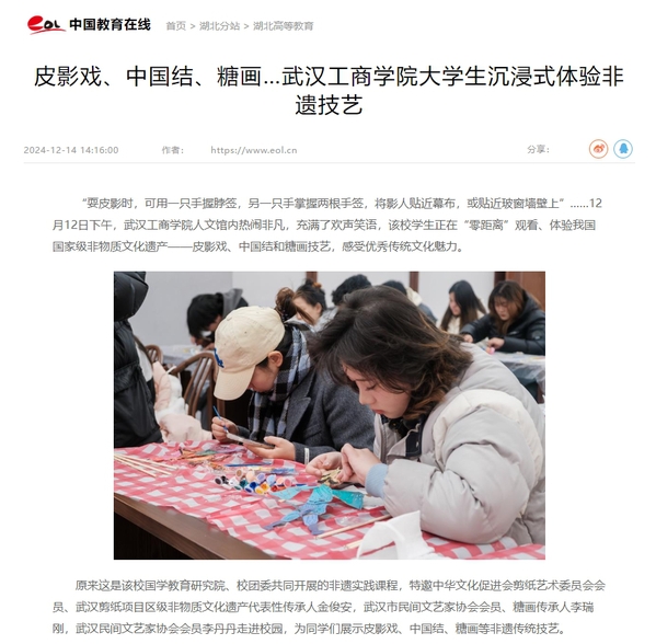 原来这是该校国学教育研究院、校团委共同开展的非遗实践课程,特邀中华文化促进会剪纸艺术委员会会员、武汉剪纸项目区级非物质文化遗产代表性传承人金俊安,武汉市民间文艺家协会会员、糖画传承人李瑞刚,武汉民间文艺家协会会员李丹丹走进校园,为同学们展示皮影戏、中国结、糖画等非遗传统技艺。