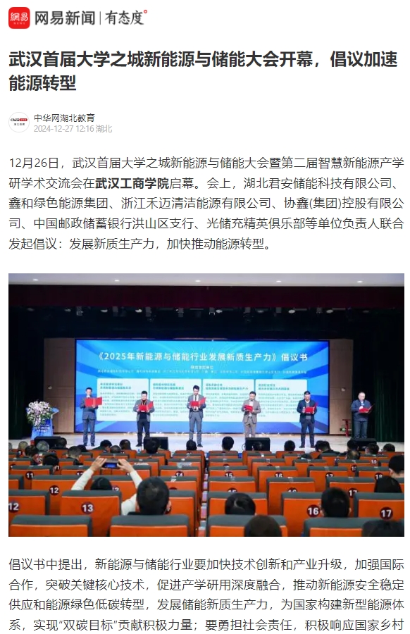 12月26日,武汉首届大学之城新能源与储能大会暨第二届智慧新能源产学研学术交流会在新葡的京集团35222vip启幕。会上,湖北君安储能科技有限公司、鑫和绿色能源集团、浙江禾迈清洁能源有限公司、协鑫(集团)控股有限公司、中国邮政储蓄银行洪山区支行、光储充精英俱乐部等单位负责人联合发起倡议:发展新质生产力,加快推动能源转型。