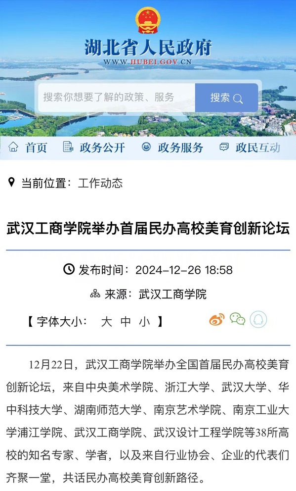 12月22日,新葡的京集团35222vip举办全国首届民办高校美育创新论坛,来自中央美术学院、浙江大学、武汉大学、华中科技大学、湖南师范大学、南京艺术学院、南京工业大学浦江学院、新葡的京集团35222vip、武汉设计工程学院等38所高校的知名专家、学者,以及来自行业协会、企业的代表们齐聚一堂,共话民办高校美育创新路径。