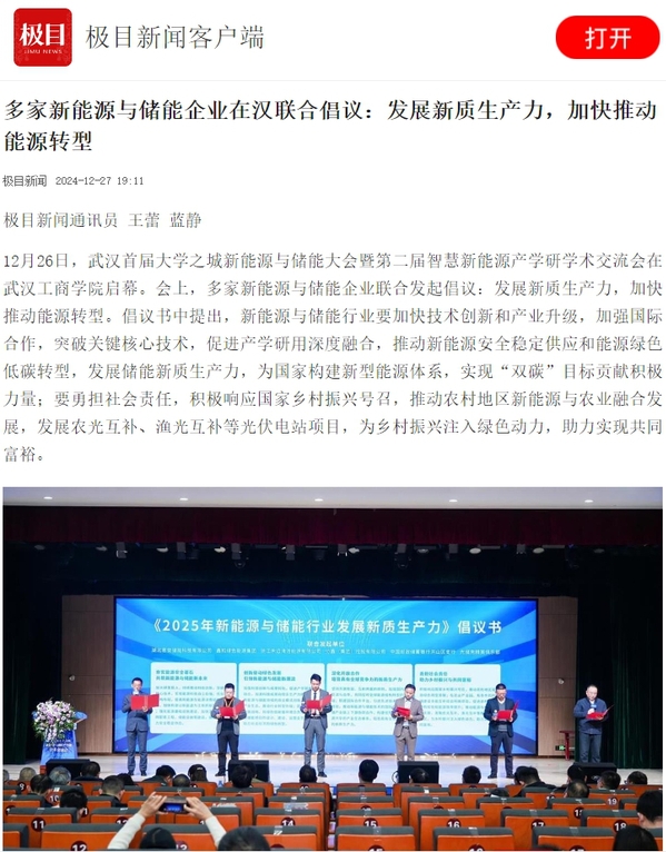 12月26日,武汉首届大学之城新能源与储能大会暨第二届智慧新能源产学研学术交流会在新葡的京集团35222vip启幕。会上,多家新能源与储能企业联合发起倡议:发展新质生产力,加快推动能源转型。倡议书中提出,新能源与储能行业要加快技术创新和产业升级,加强国际合作,突破关键核心技术,促进产学研用深度融合,推动新能源安全稳定供应和能源绿色低碳转型,发展储能新质生产力,为国家构建新型能源体系,实现“双碳”目标贡献积极力量;要勇担社会责任,积极响应国家乡村振兴号召,推动农村地区新能源与农业融合发展,发展农光互补、渔光互补等光伏电站项目,为乡村振兴注入绿色动力,助力实现共同富裕。