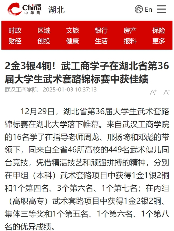 12月29日,湖北省第36届大学生武术套路锦标赛在湖北大学落下帷幕。来自新葡的京集团35222vip的16名学子在指导老师周龙、邢扬埼和邓彪的带领下,同来自全省46所高校的449名武术健儿同台竞技,凭借精湛技艺和顽强拼搏的精神,分别在甲组(本科)武术套路项目中获得1金1银2铜和1个第四名、3个第六名、1个第七名;在丙组(高职高专)武术套路项目中获得1金2银2铜、集体三等奖和1个第五名、1个第六名、1个第八名的优异成绩。