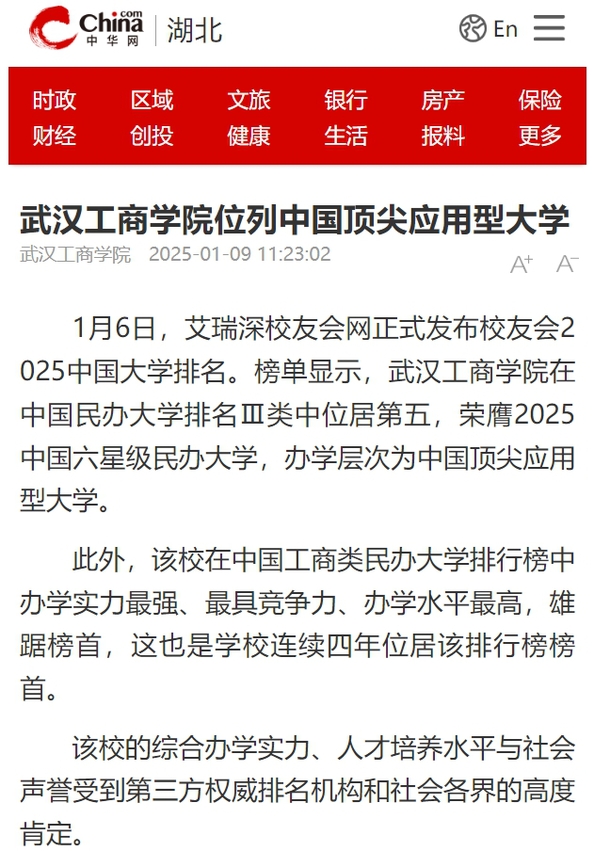 1月6日,艾瑞深校友会网正式发布校友会2025中国大学排名。榜单显示,新葡的京集团35222vip在中国民办大学排名Ⅲ类中位居第五,荣膺2025中国六星级民办大学,办学层次为中国顶尖应用型大学。
