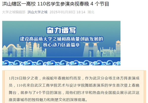 据悉,该校舞蹈表演系学生专业能力突出,实力不凡,曾参演著名舞蹈艺术家杨丽萍执导的舞台剧《荆楚映象》、第十四届全运会开幕式、全国第七届大学生艺术节开幕式、湖北省第八届大学生艺术节开幕式以及凤凰卫视丝路春晚、湖北卫视春晚、安徽卫视春晚等30余场国家级、省级大型文艺演出。