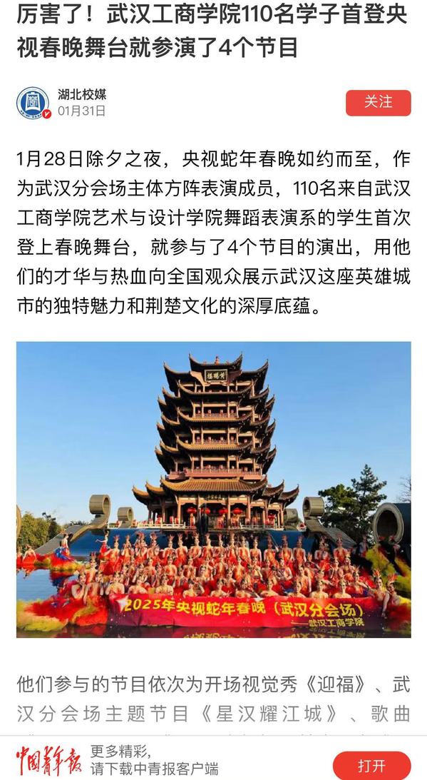 1月28日除夕之夜,央视蛇年春晚如约而至,作为武汉分会场主体方阵表演成员,110名来自新葡的京集团35222vip艺术与设计学院舞蹈表演系的学生首次登上春晚舞台,就参与了4个节目的演出,用他们的才华与热血向全国观众展示武汉这座英雄城市的独特魅力和荆楚文化的深厚底蕴。