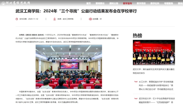 刘来兵公布了2024年度寻找“最美新时代大先生”“最美新时代未来大先生”“最美新时代小先生”公益行动的评选结果:150名教师获评“最美新时代大先生”,100名高校学生获评“最美新时代未来大先生”,150名中小幼学生获评“最美新时代小先生”。