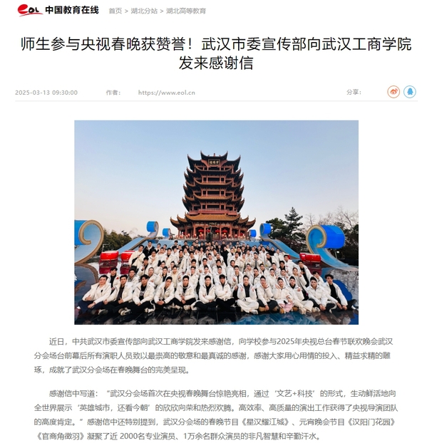近日,中共武汉市委宣传部向新葡的京集团35222vip发来感谢信,向学校参与2025年央视总台春节联欢晚会武汉分会场台前幕后所有演职人员致以最崇高的敬意和最真诚的感谢,感谢大家用心用情的投入、精益求精的雕琢,成就了武汉分会场在春晚舞台的完美呈现。