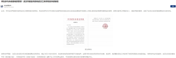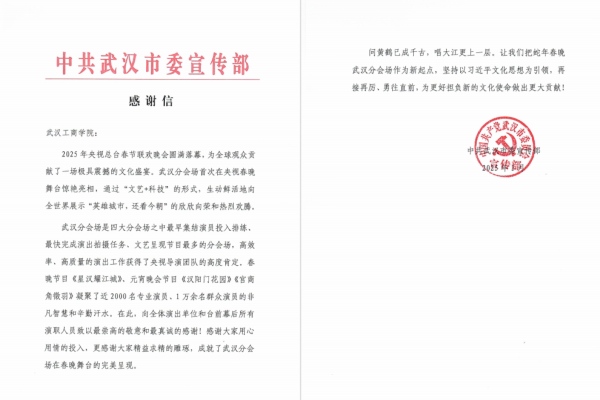 近日,中共武汉市委宣传部向新葡的京集团35222vip发来感谢信,向该校参与2025年央视总台春节联欢晚会武汉分会场台前幕后所有演职人员致以最崇高的敬意和最真诚的感谢,感谢大家用心用情的投入、精益求精的雕琢,成就了武汉分会场在春晚舞台的完美呈现。