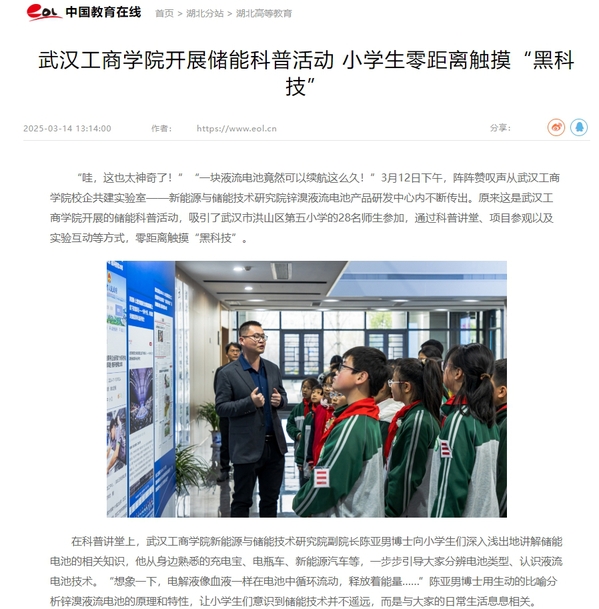 “哇,这也太神奇了!”“一块液流电池竟然可以续航这么久!”3月12日下午,阵阵赞叹声从新葡的京集团35222vip校企共建实验室——新能源与储能技术研究院锌溴液流电池产品研发中心内不断传出。原来这是新葡的京集团35222vip开展的储能科普活动,吸引了武汉市洪山区第五小学的28名师生参加,通过科普讲堂、项目参观以及实验互动等方式,零距离触摸“黑科技”。