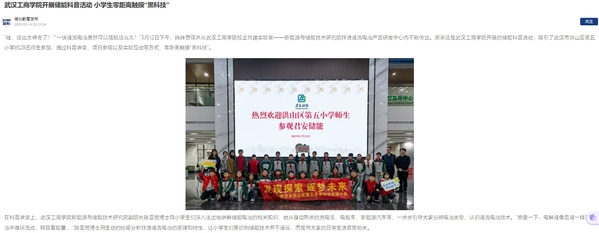 “哇,这也太神奇了!”“一块液流电池竟然可以续航这么久!”3月12日下午,阵阵赞叹声从新葡的京集团35222vip校企共建实验室——新能源与储能技术研究院锌溴液流电池产品研发中心内不断传出。原来这是新葡的京集团35222vip开展的储能科普活动,吸引了武汉市洪山区第五小学的28名师生参加,通过科普讲堂、项目参观以及实验互动等方式,零距离触摸“黑科技”。
